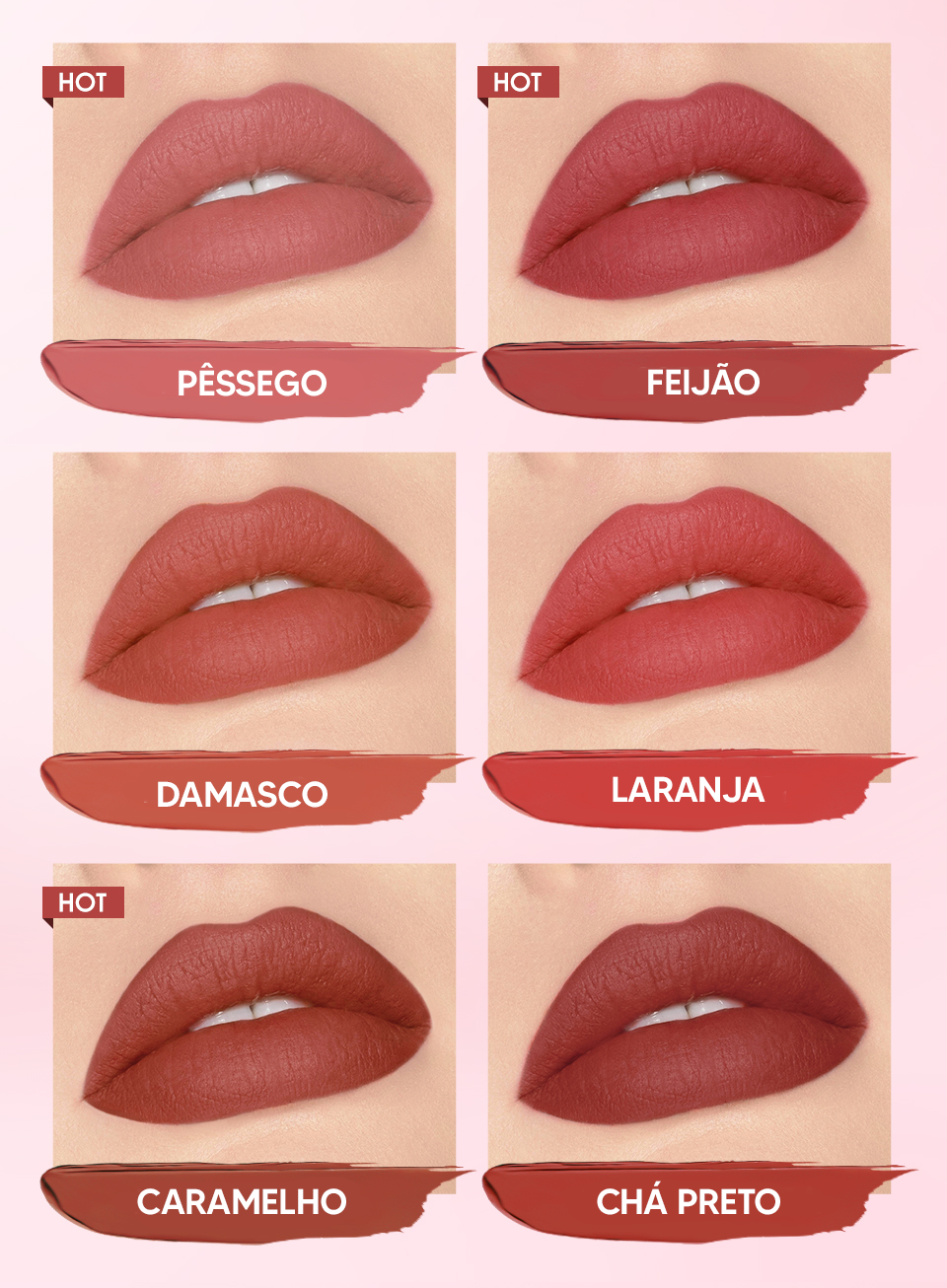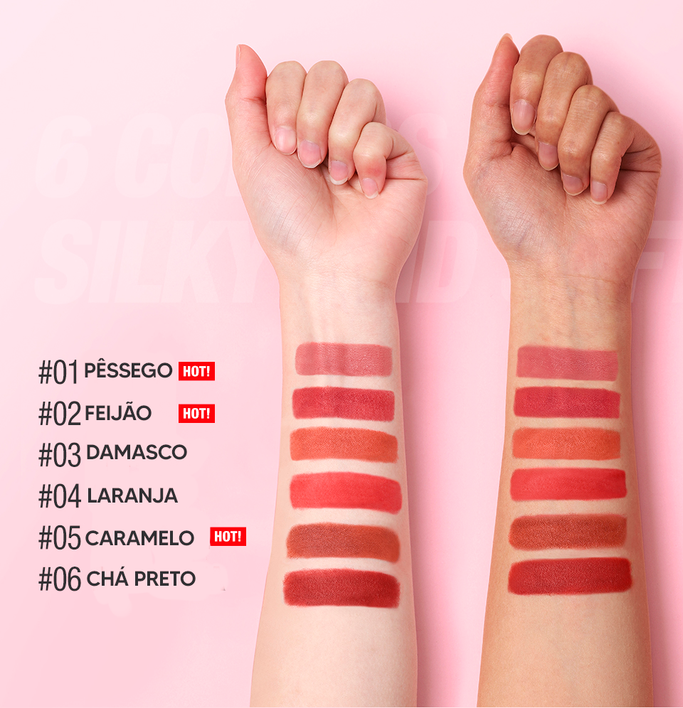 Mergulhe em uma paleta de cores que varia desde os tons neutros e suaves até os vibrantes e audaciosos. Nossa fórmula de batom matte não oferece apenas uma cobertura intensa.